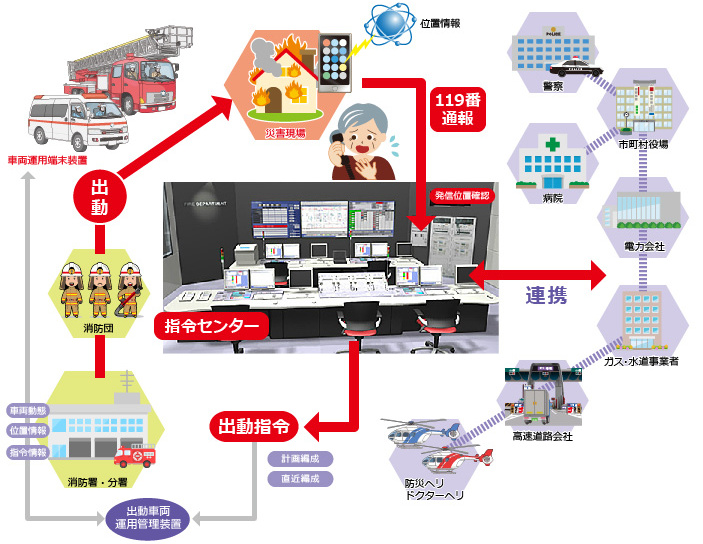 近年、災害は益々多様化し、火災・救急・救助の現場は困難な事態が発生します。高機能消防指令センターは、このような災害通報から事案終了まで円滑な消防の指令業務を遂行する重要な通信システムとなります。